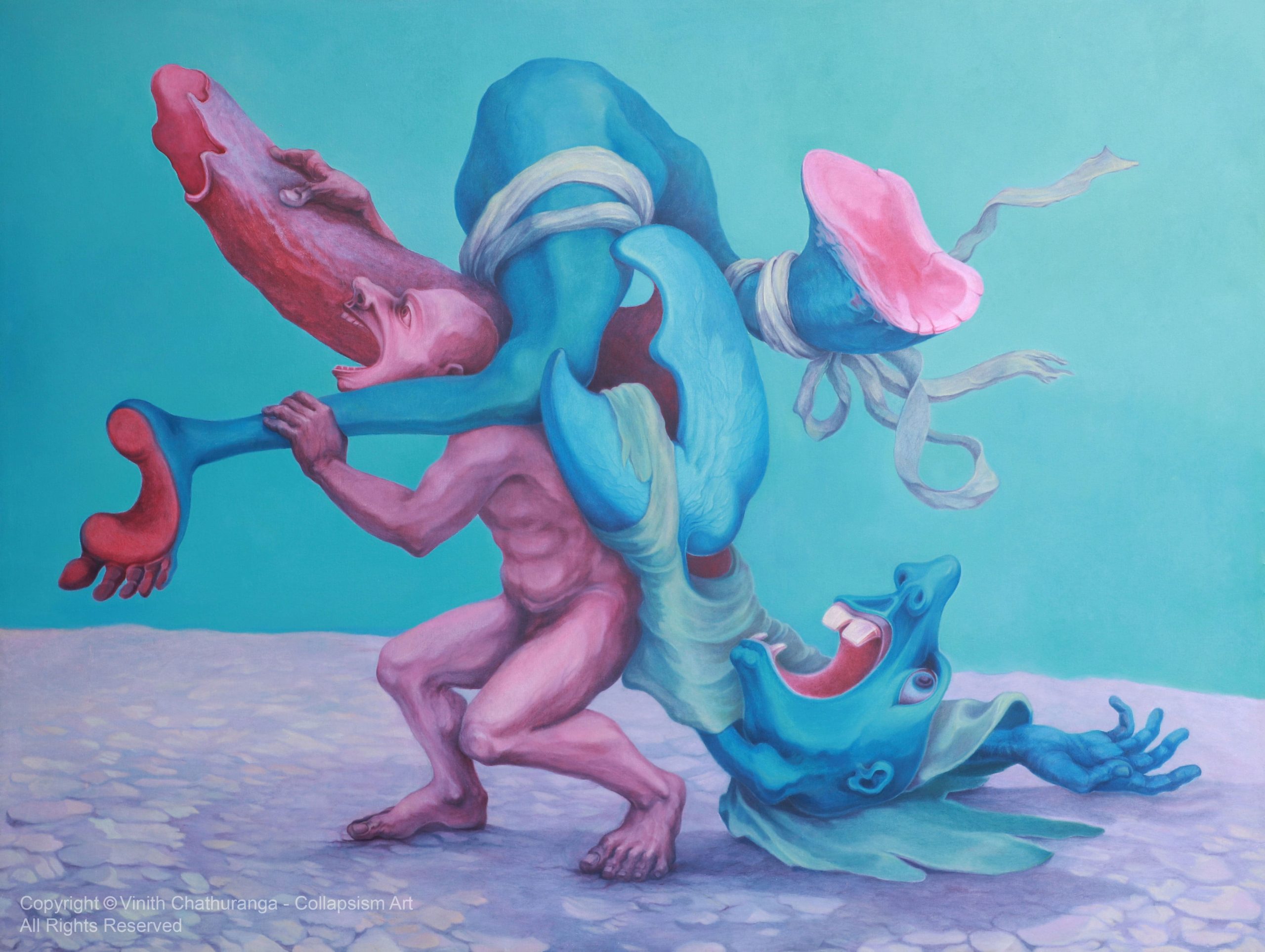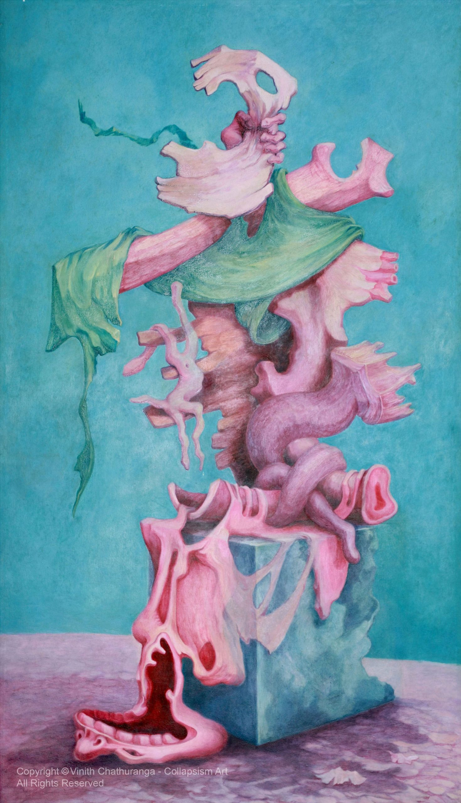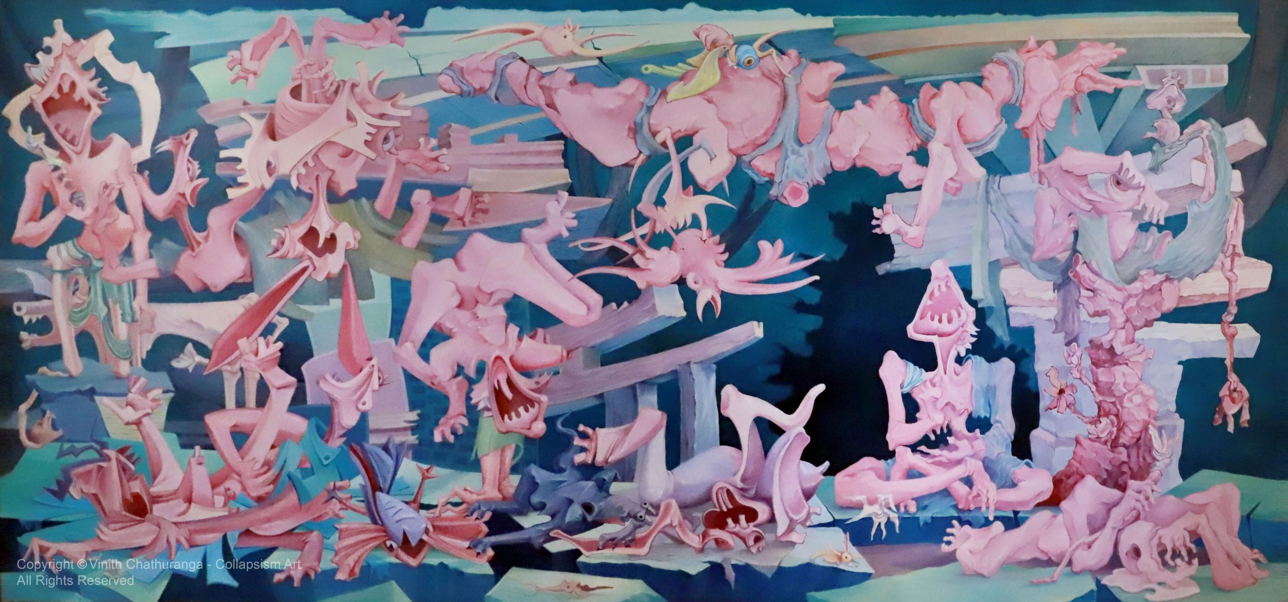 - While diverging completely from academic traditions, Collapsism incorporates new conceptual streams, along with abstract and semi-abstract formats and content that had not previously appeared in Sri Lanka. Some works display naturalistic, magical, hyperrealistic, cubic, or surrealist elements, extending beyond the conceptual and thematic boundaries of 1990s Sri Lankan art.