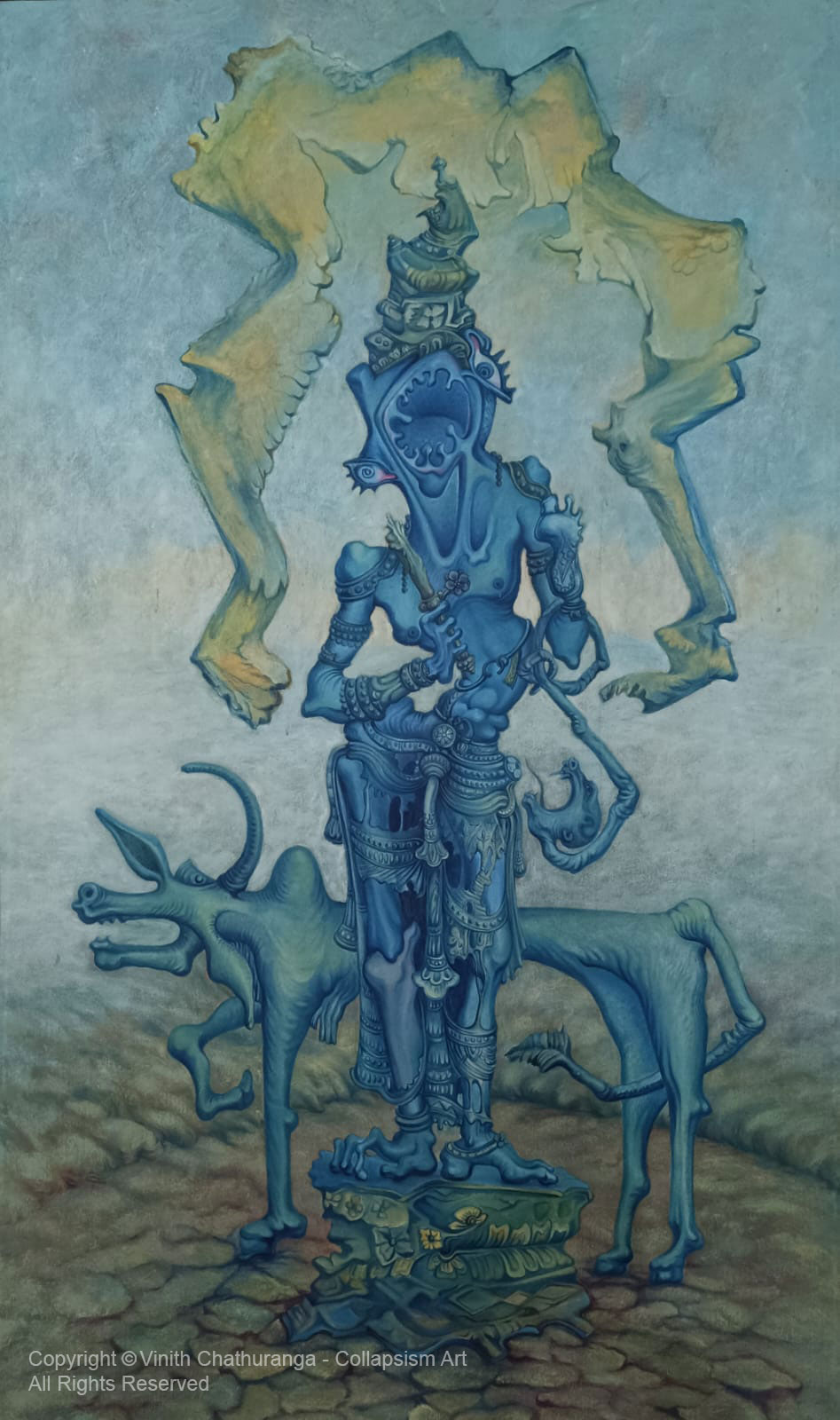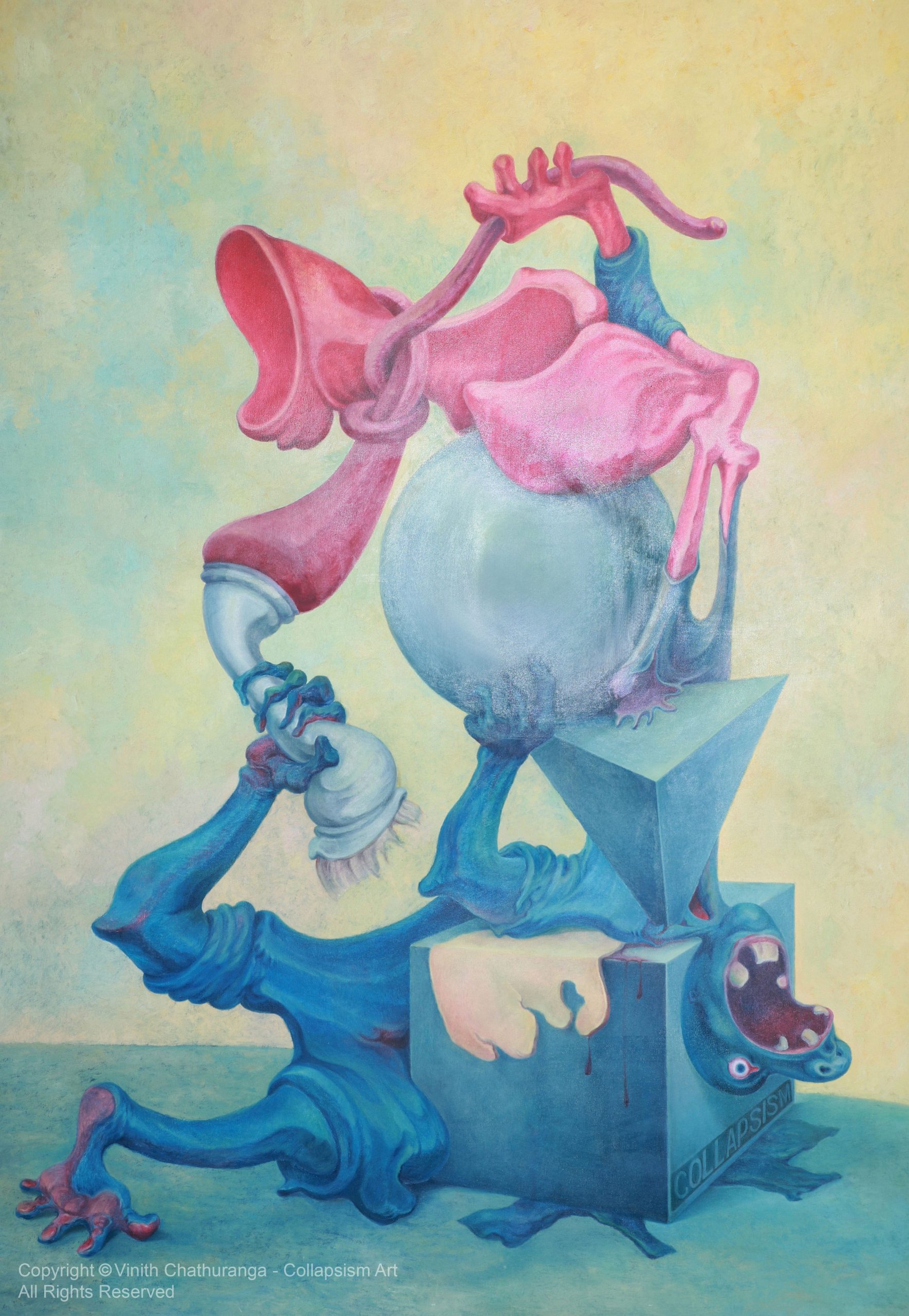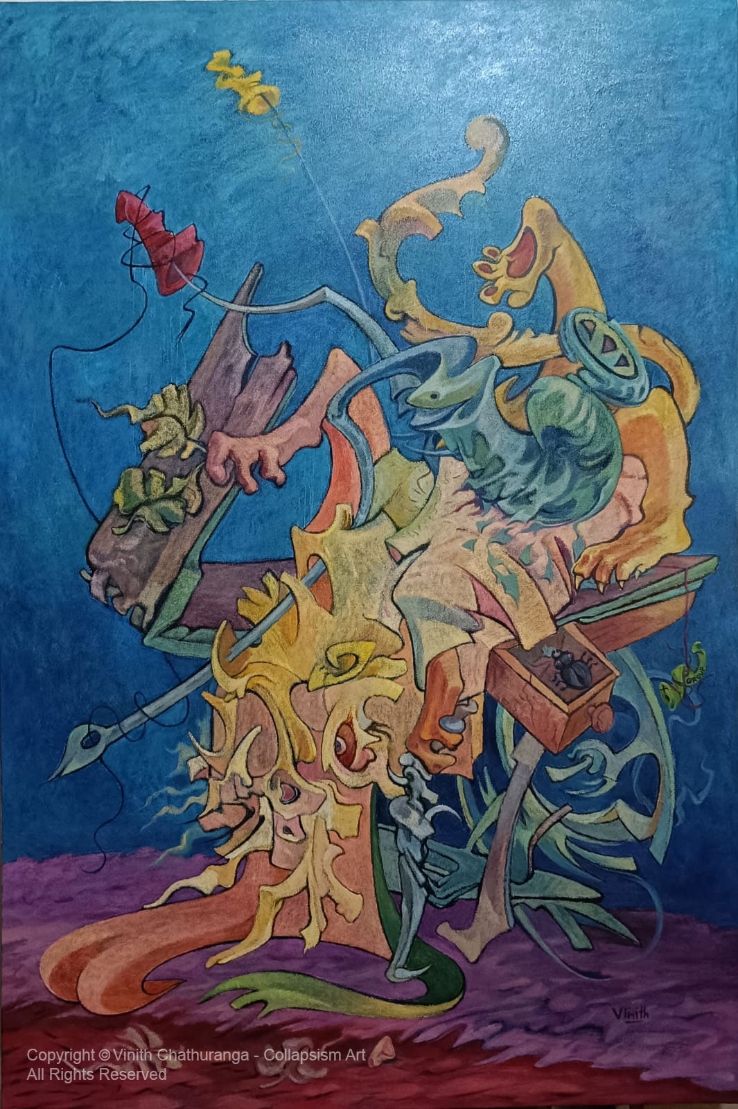 - Explorations of time and space introduce dynamic, multidimensional layers to the artwork. Elegance and fantasy combine refined aesthetics with imaginative, fantastical expression, making Collapsism both visually compelling and intellectually engaging. Together, these visual contexts establish the movement as a significant trend in contemporary Sri Lankan art.